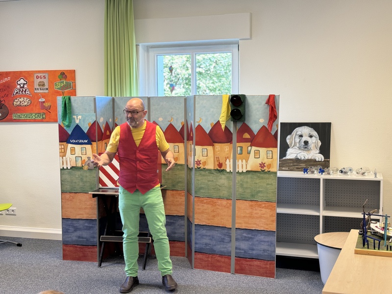 Im Rahmen der Verkehrserziehung hatten wir in diesem Jahr wieder das Vergnügen, den Verkehrszauberer an unserer Schule zu begrüßen. Mit einer gelungenen Mischung aus Magie und Humor vermittelte er den Schülerinnen und Schülern des ersten und zweiten Jahrgangs die wichtigsten Verkehrsregeln. Seine Vorstellung begeisterte nicht nur die Kinder, sondern auch die Lehrkräfte.